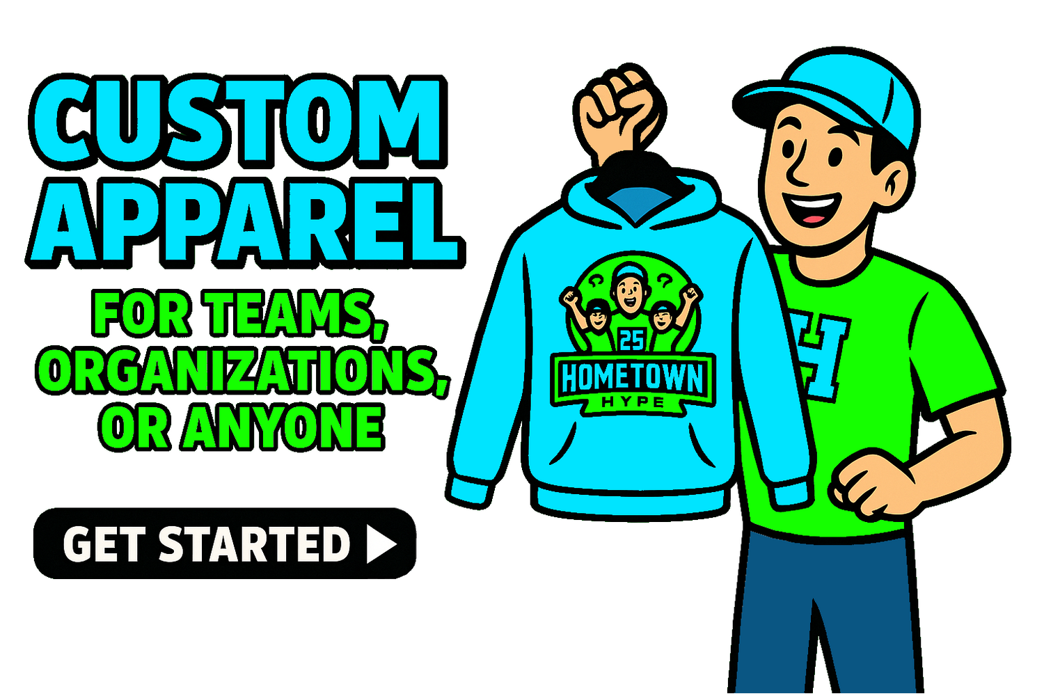 No matter the size of your team or organization, we work with you every step of the way to bring your vision to life. Our apparel isn’t just about looking good—it’s about building unity, spirit, and hype around what you represent. Hometown Hype makes sure you have the gear to represent your group.