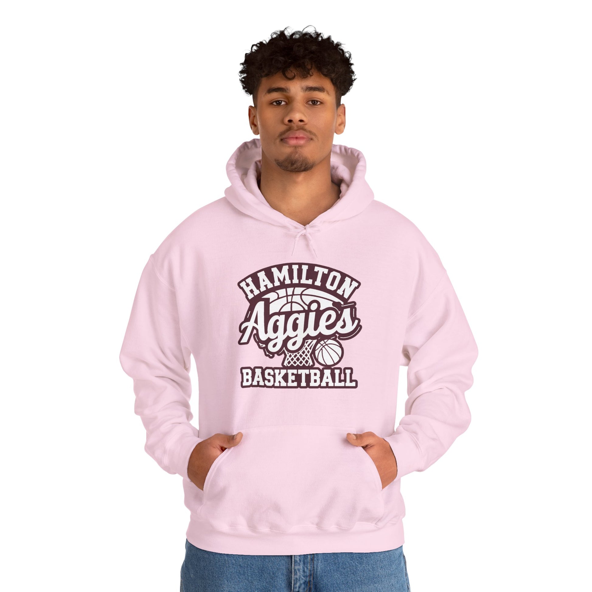 This cozy hoodie brings game-day pride to everyday life. Soft, medium-heavy fleece wraps you in warmth while a vintage-style basketball crest — “Hamilton Aggies Basketball” with hoop and ball graphics — sits proudly on the chest. The double-lined hood and color-matched drawcord add thoughtful detail, while the roomy kangaroo pocket keeps hands warm or holds small essentials. Worn to practices, school nights, or weekend runs, the hoodie feels familiar and durable: a lived-in staple that carries team spirit without shouting. Subtle, classic lettering and a balanced layout make it easy to layer with jackets or wear alone between seasons.
