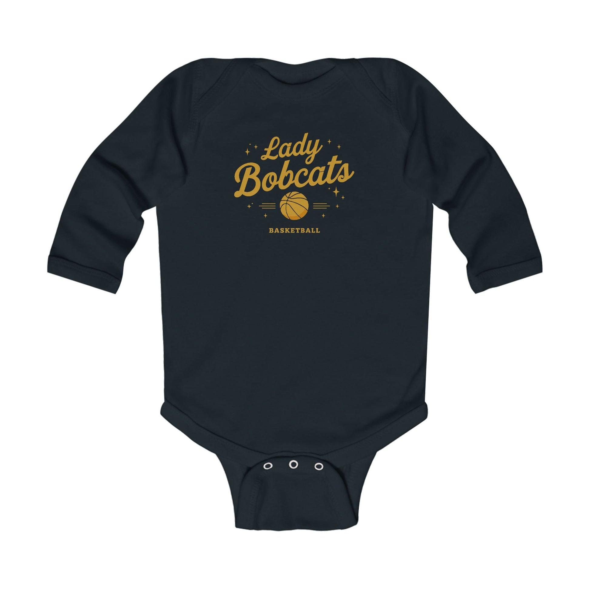 Little fans start here. This long-sleeve infant bodysuit carries a vintage-inspired “Lady Bobcats” basketball crest across the chest — warm golds and deep black ink that feel like game-night banners shrunk down to baby size. Soft, lightweight cotton hugs tiny shoulders while the ribbed neckline and cuffs move with every wiggle. Snap closures at the bottom make quick changes less of a scramble so mom, dad, or grandma can get baby dressed and back to cheering. It’s the kind of piece that belongs in a family photo on the sofa after a hometown win, tucked under a jacket on chilly bleacher nights, or worn around the house while older siblings practice layups.