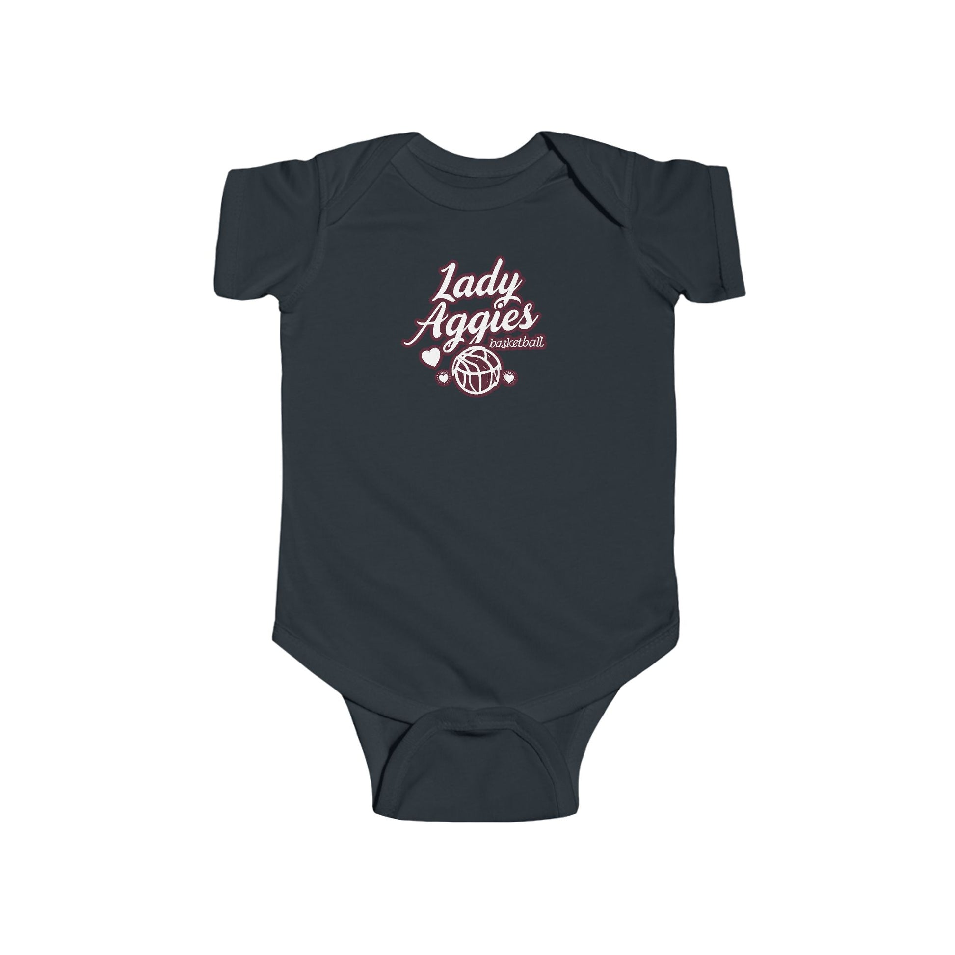 Soft, breathable baby bodysuit with a small, vintage-inspired “Lady Aggies” basketball script printed on the chest. The lightweight combed ringspun cotton feels gentle against newborn skin while the ribbed knit binding at the neck and armholes lets little ones move comfortably. Side seams keep the shape wash after wash, and matching plastic snaps at the crotch make quick changes easy. It’s REACH certified and comes with a tear-away label for added comfort. A simple, sporty piece that layers well under sweaters or pairs perfectly with tiny leggings for game-day photos or everyday wear.