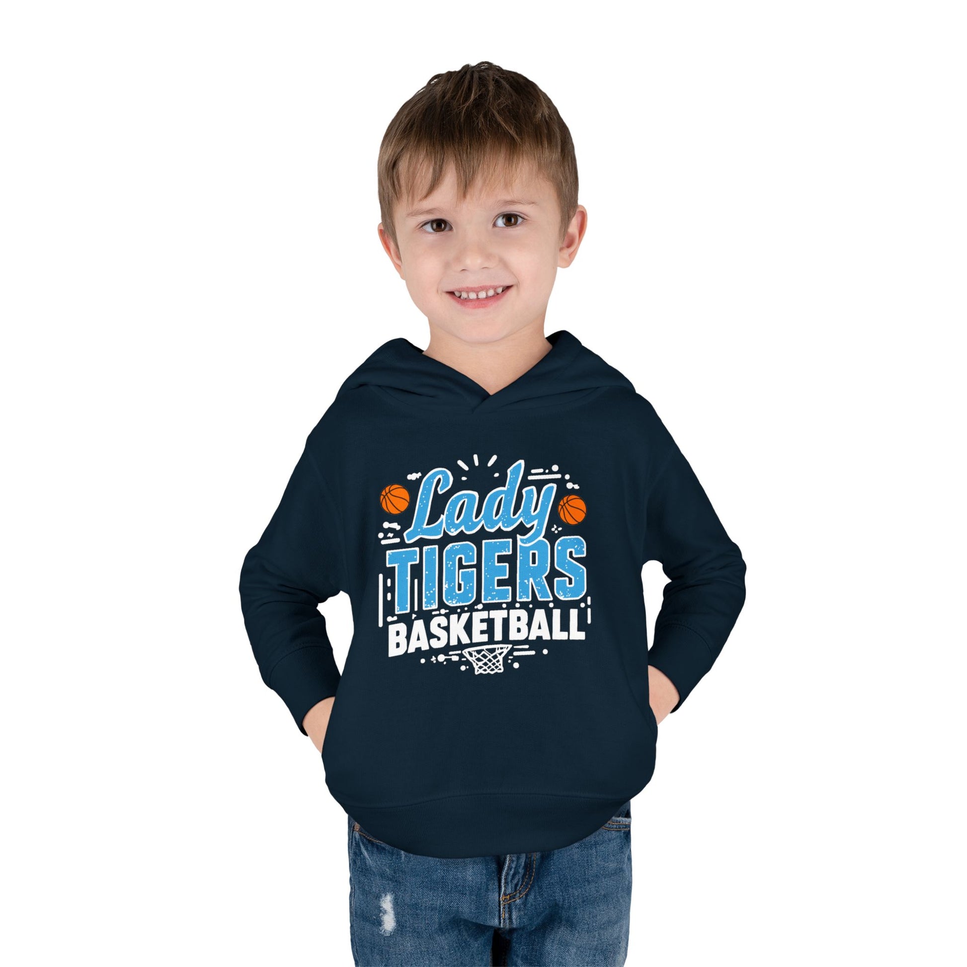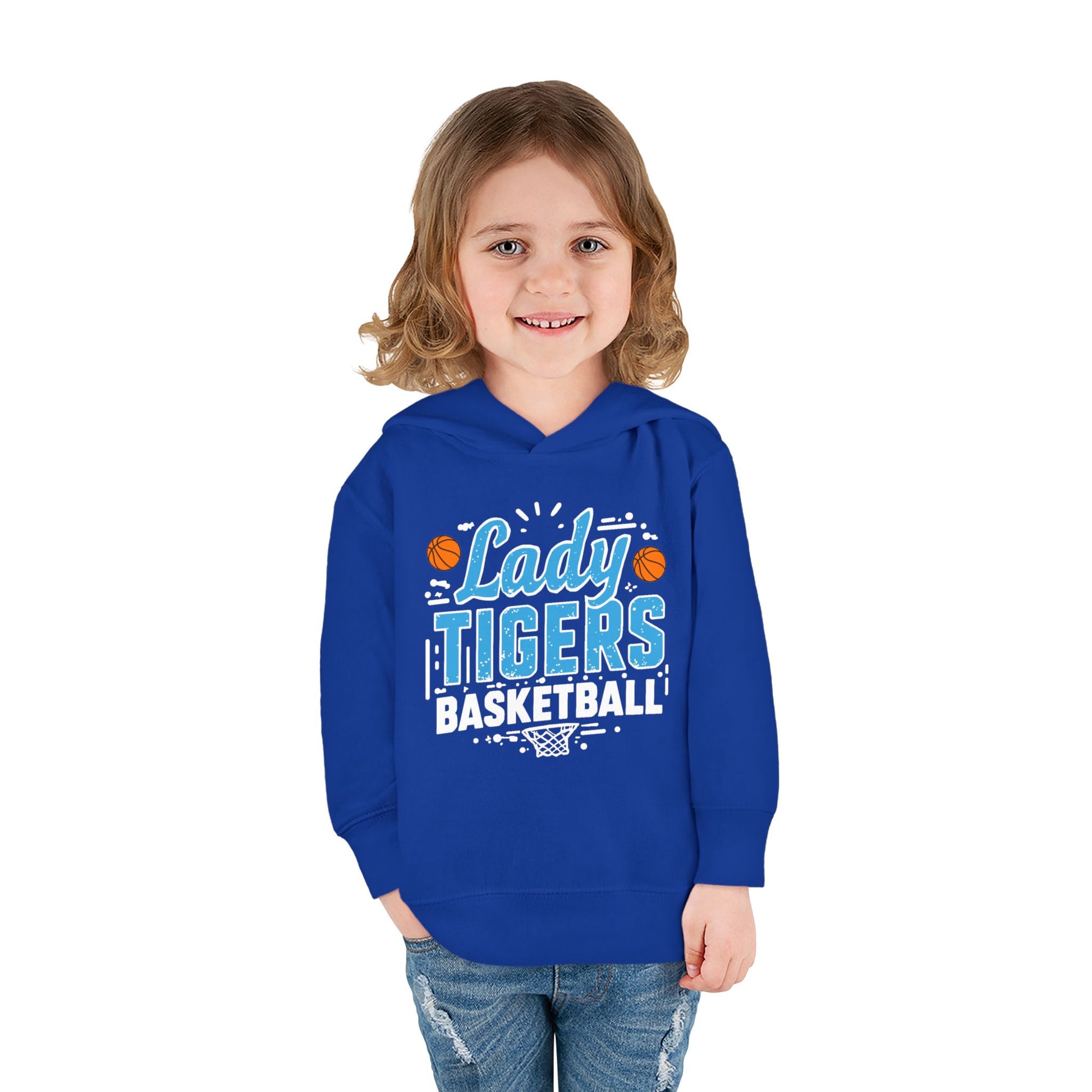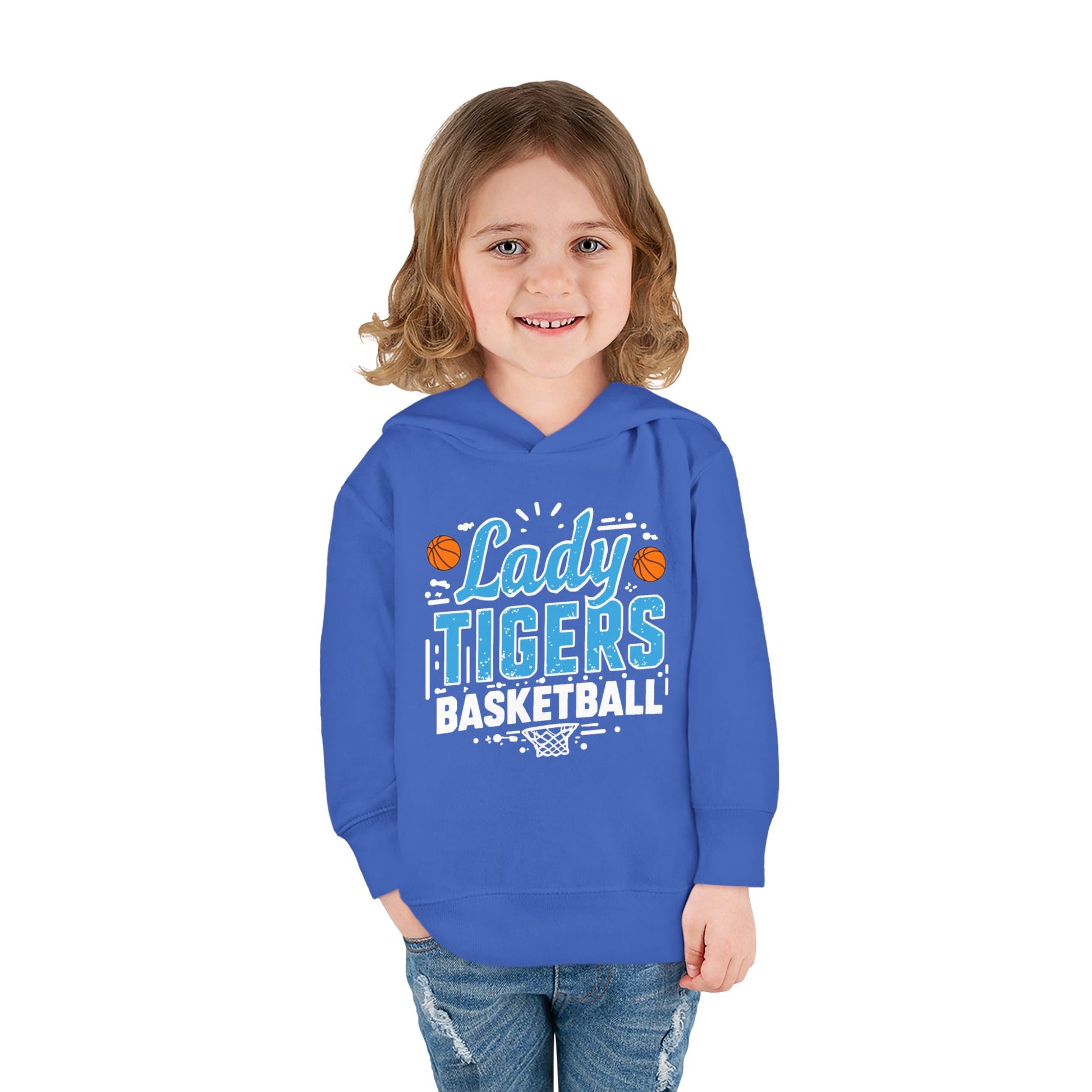 Soft, cozy, and bright — this toddler pullover hoodie brings team spirit to small adventures. Lightweight fleece hugs little shoulders while a jersey-lined hood keeps ears warm on chilly sidelines. The bold “Lady Tigers Basketball” graphic pops in playful blues and orange basketball accents, so your youngster looks like part of the squad even when cheering from the stands or running drills in the driveway. Practical touches — side-seam pockets for tiny treasures, ribbed cuffs and waistband to hold shape after washes, and a tear-away label for scratch-free comfort — make this hoodie as easy to wear as it is to love. It layers effortlessly over tees for cooler mornings and pairs with joggers or leggings for active play.