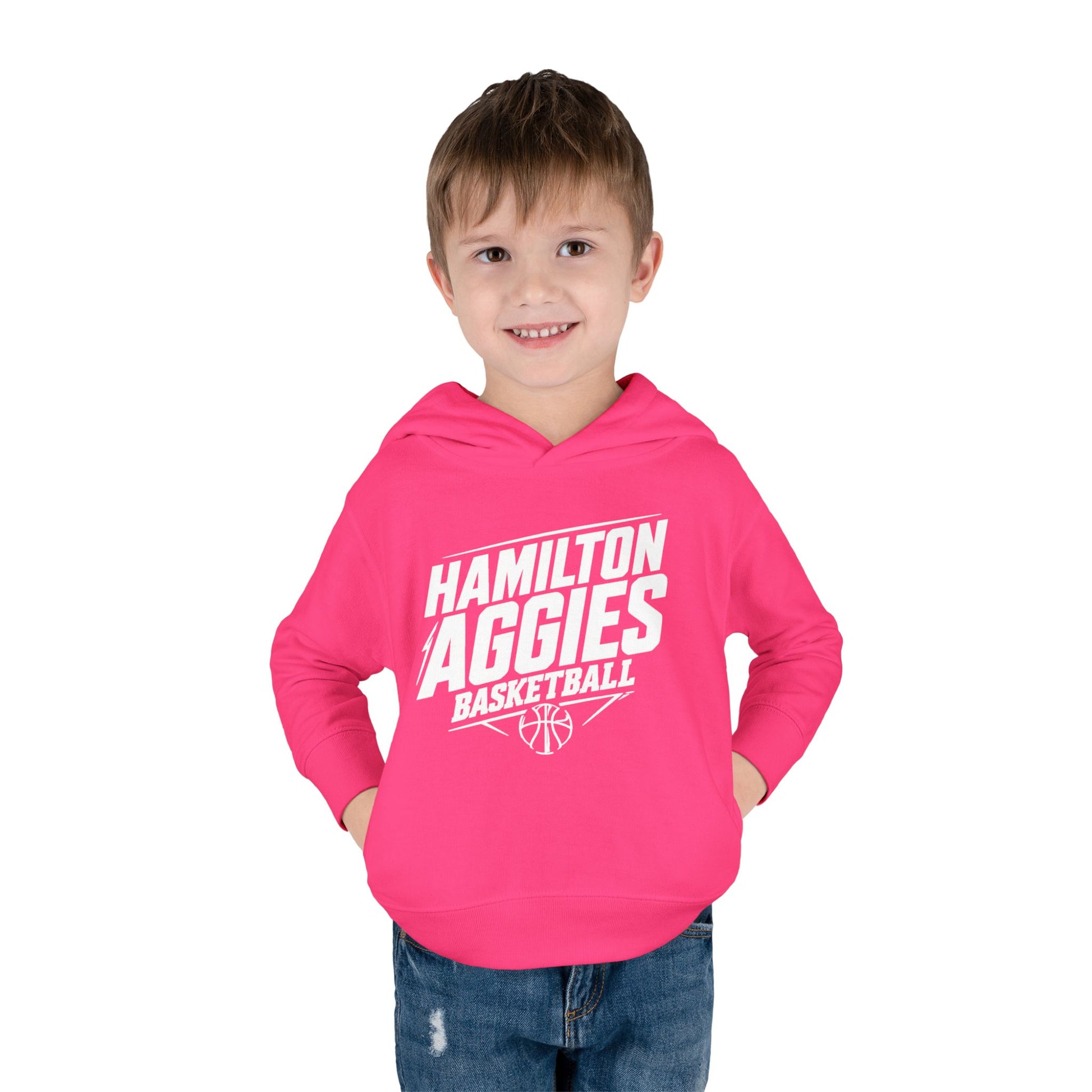 A cozy toddler hoodie that brings team spirit to little fans. Soft, midweight fleece wraps small shoulders in a gentle, brushed interior while a bold ‘Hamilton Aggies Basketball’ crest sits front and center—ready for sidelines, school days, or post-practice warmups. The hood and jersey-lined hem add a snug layer of warmth, and side pockets keep tiny hands comfortable. Built to move with reinforced coverstitching and ribbed cuffs, this hoodie wears like a favorite from day one and keeps its shape through active play.