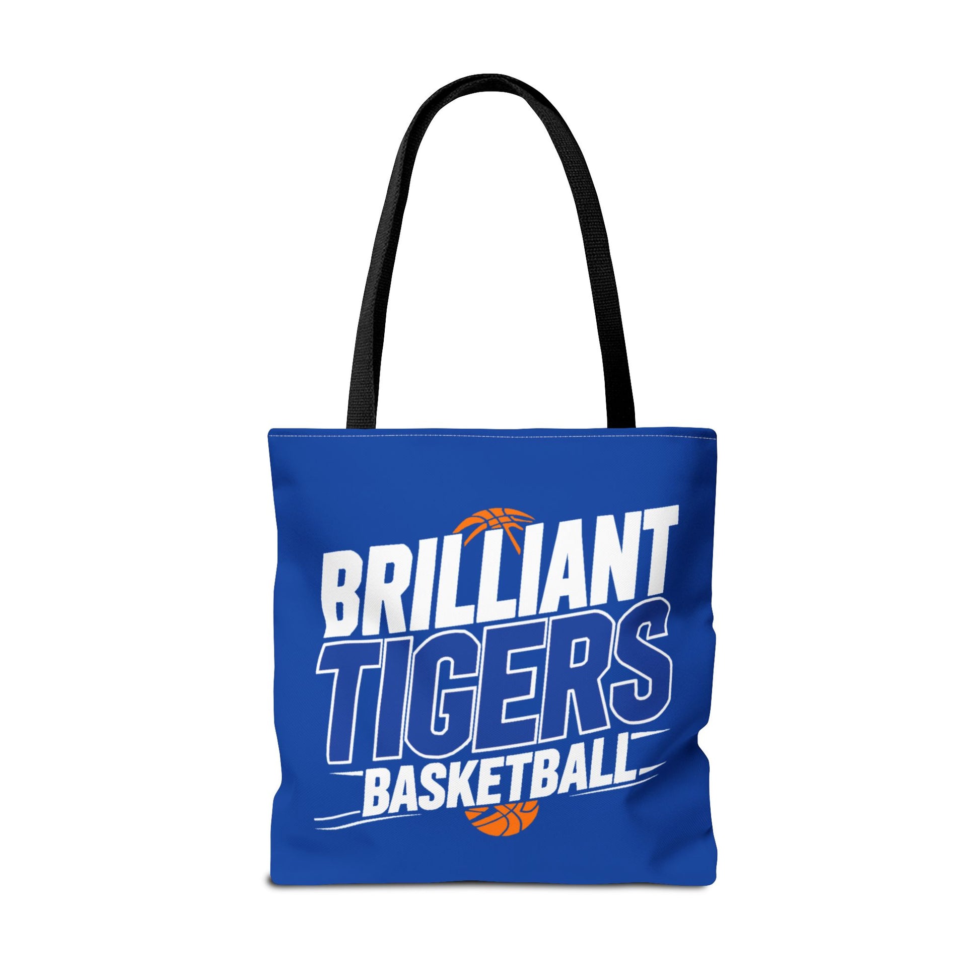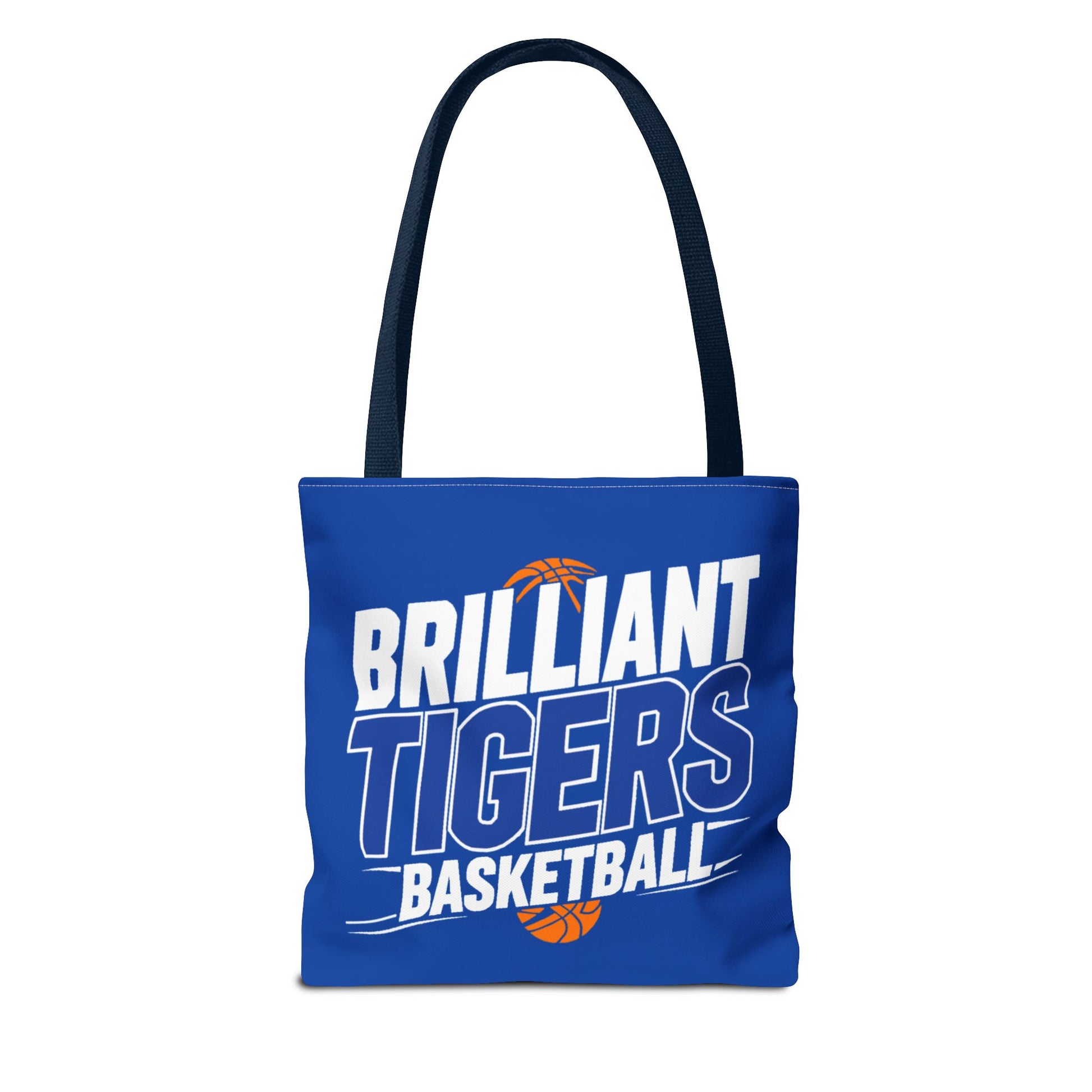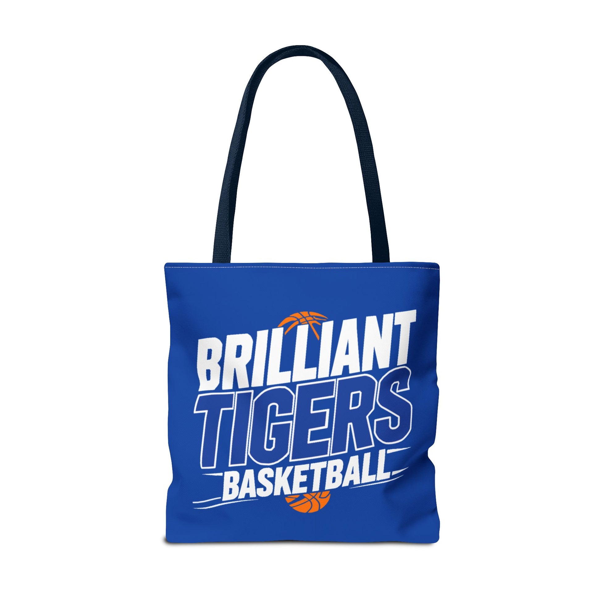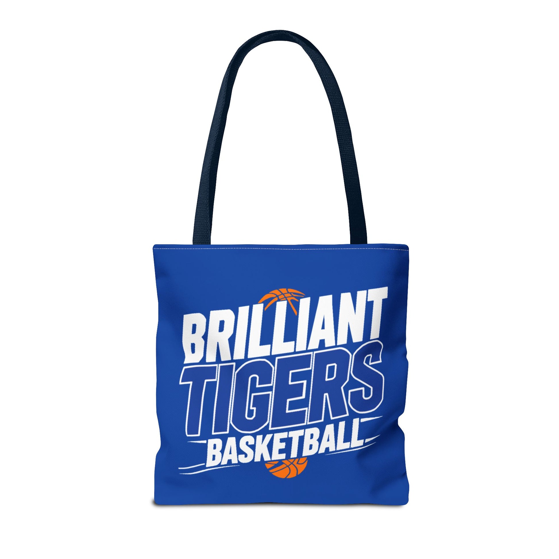 This roomy, durable tote brings team pride into everyday life. Bright royal blue fabric is printed all-over with bold, varsity-style lettering that reads “Brilliant Tigers Basketball,” accented by a small orange basketball motif. The sturdy polyester body and boxed corners give it structure so books, gear, or game-day snacks keep their shape. Reinforced handle stitching and a laminated interior mean it stands up to frequent use — from practice runs to fan tailgates. Carry it to games, school, or weekend errands and let the team colors lead the way.