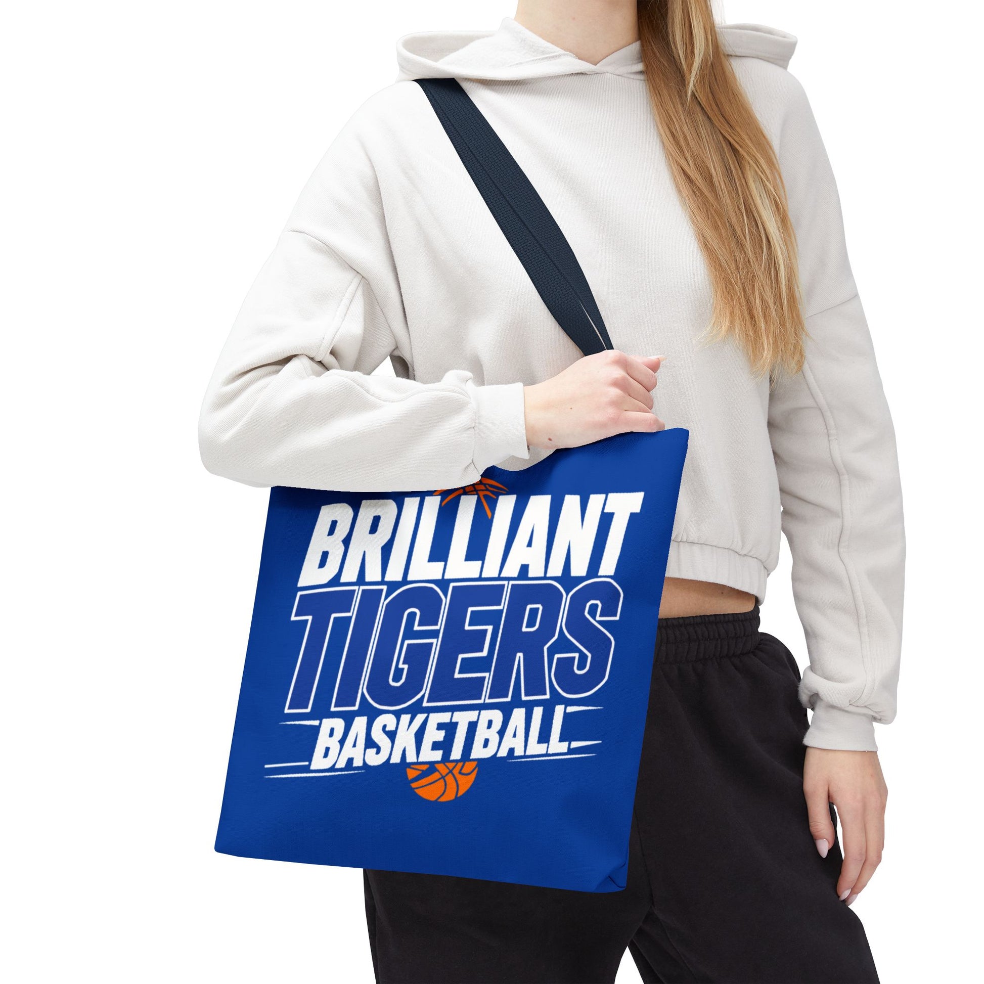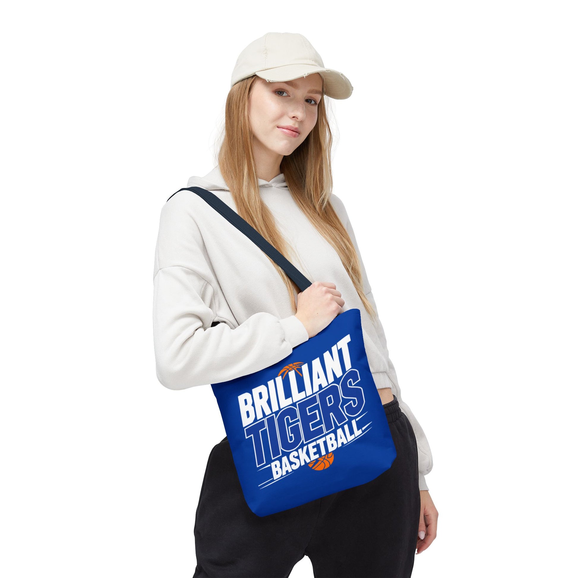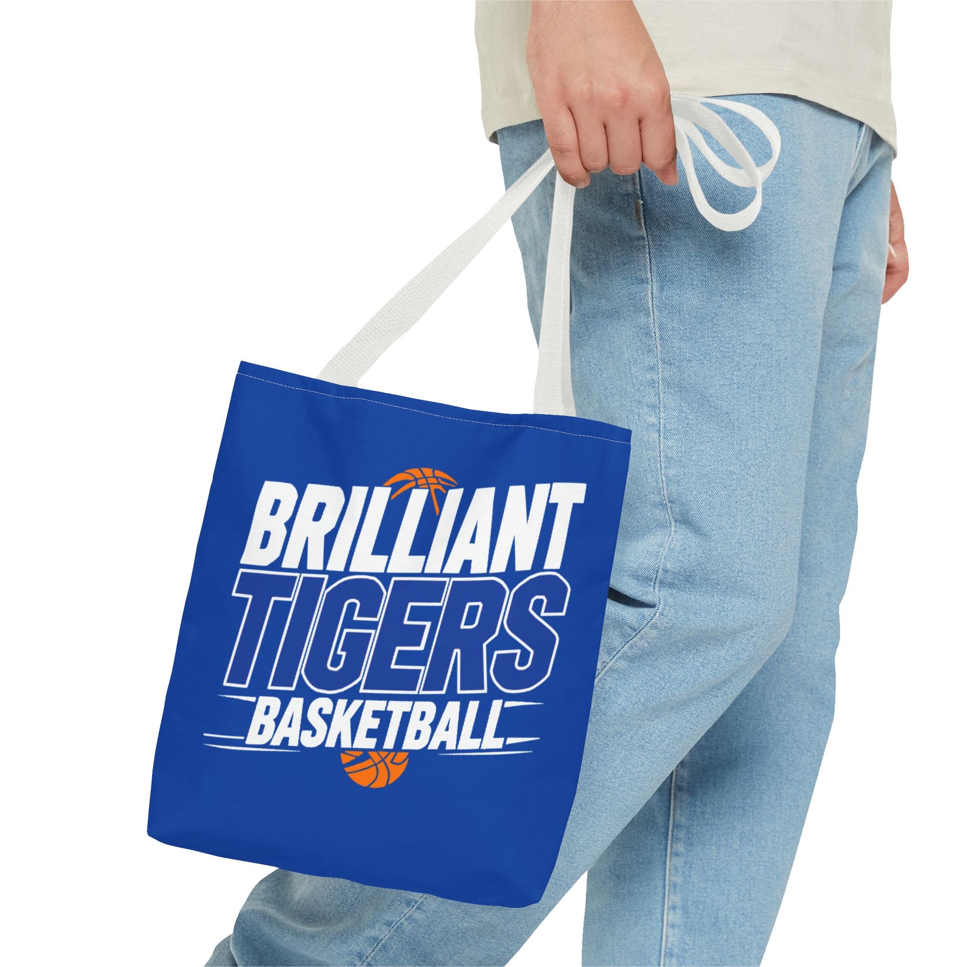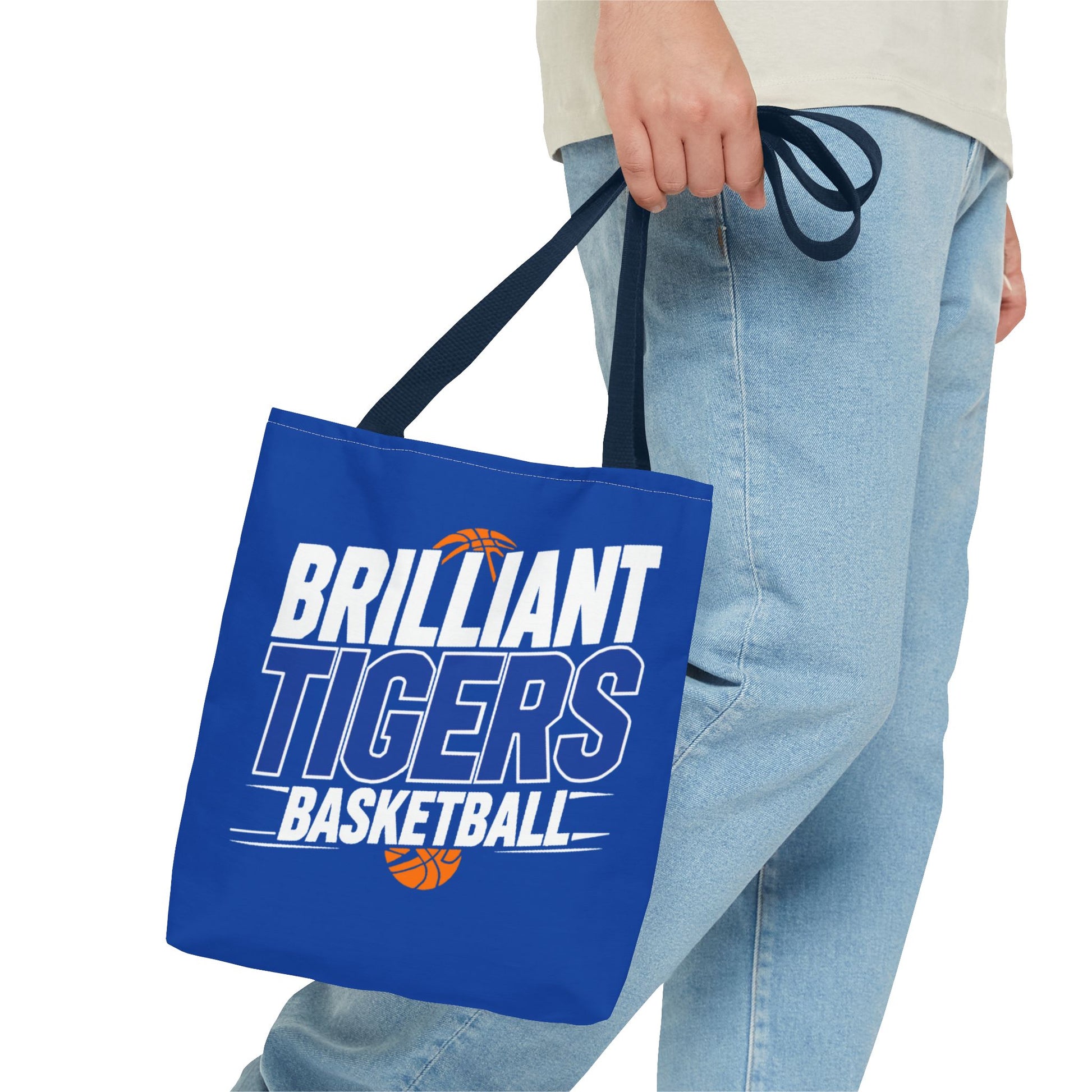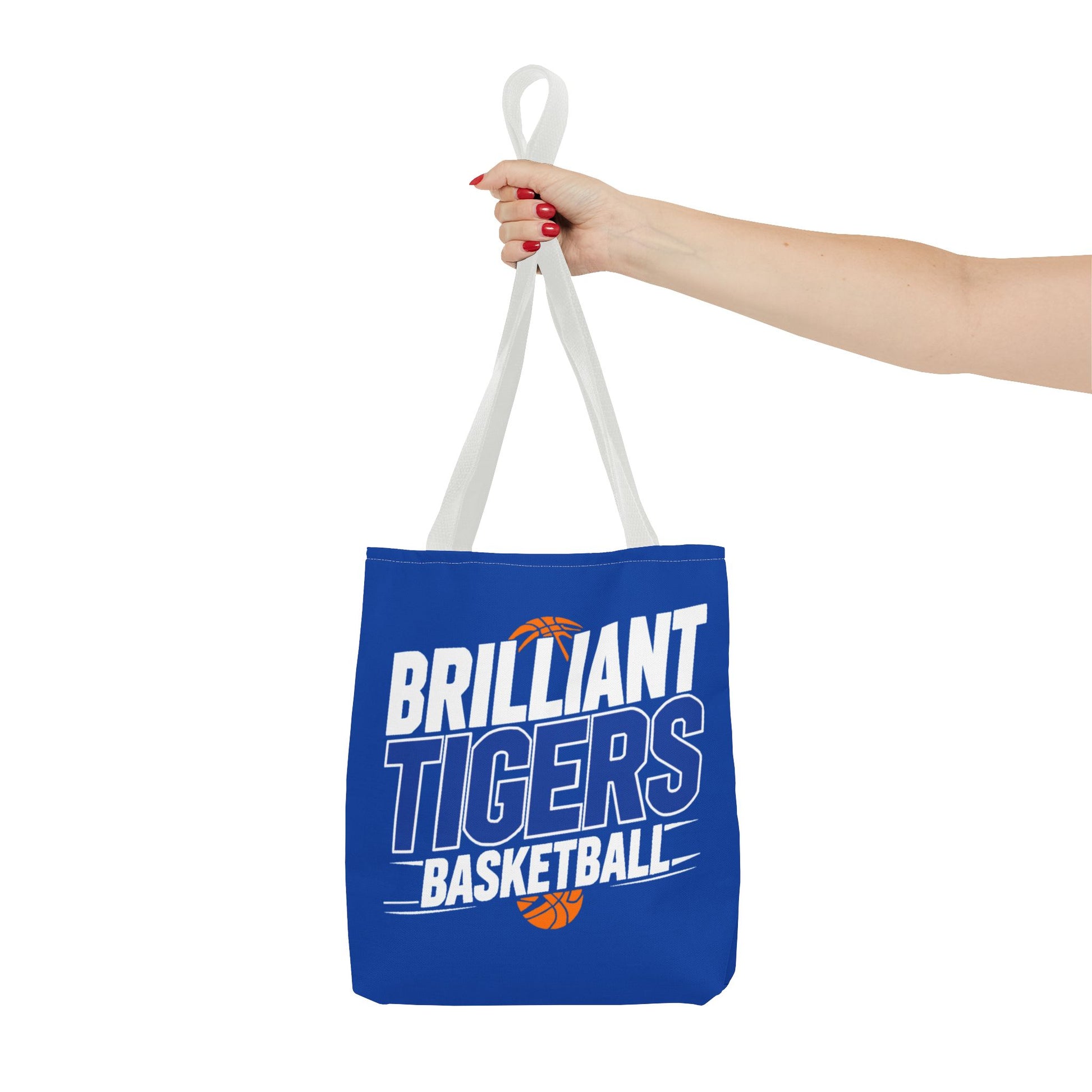 This roomy, durable tote brings team pride into everyday life. Bright royal blue fabric is printed all-over with bold, varsity-style lettering that reads “Brilliant Tigers Basketball,” accented by a small orange basketball motif. The sturdy polyester body and boxed corners give it structure so books, gear, or game-day snacks keep their shape. Reinforced handle stitching and a laminated interior mean it stands up to frequent use — from practice runs to fan tailgates. Carry it to games, school, or weekend errands and let the team colors lead the way.