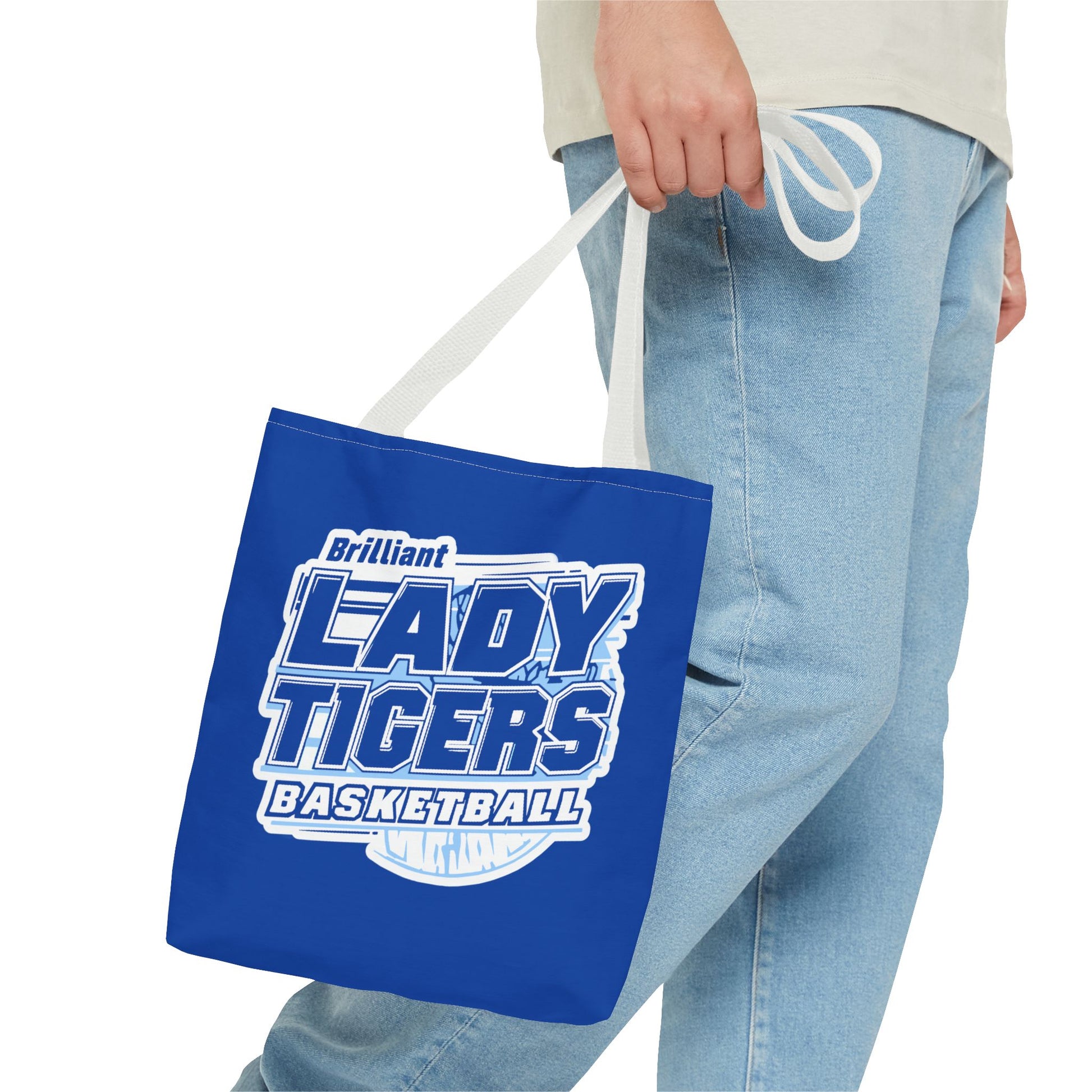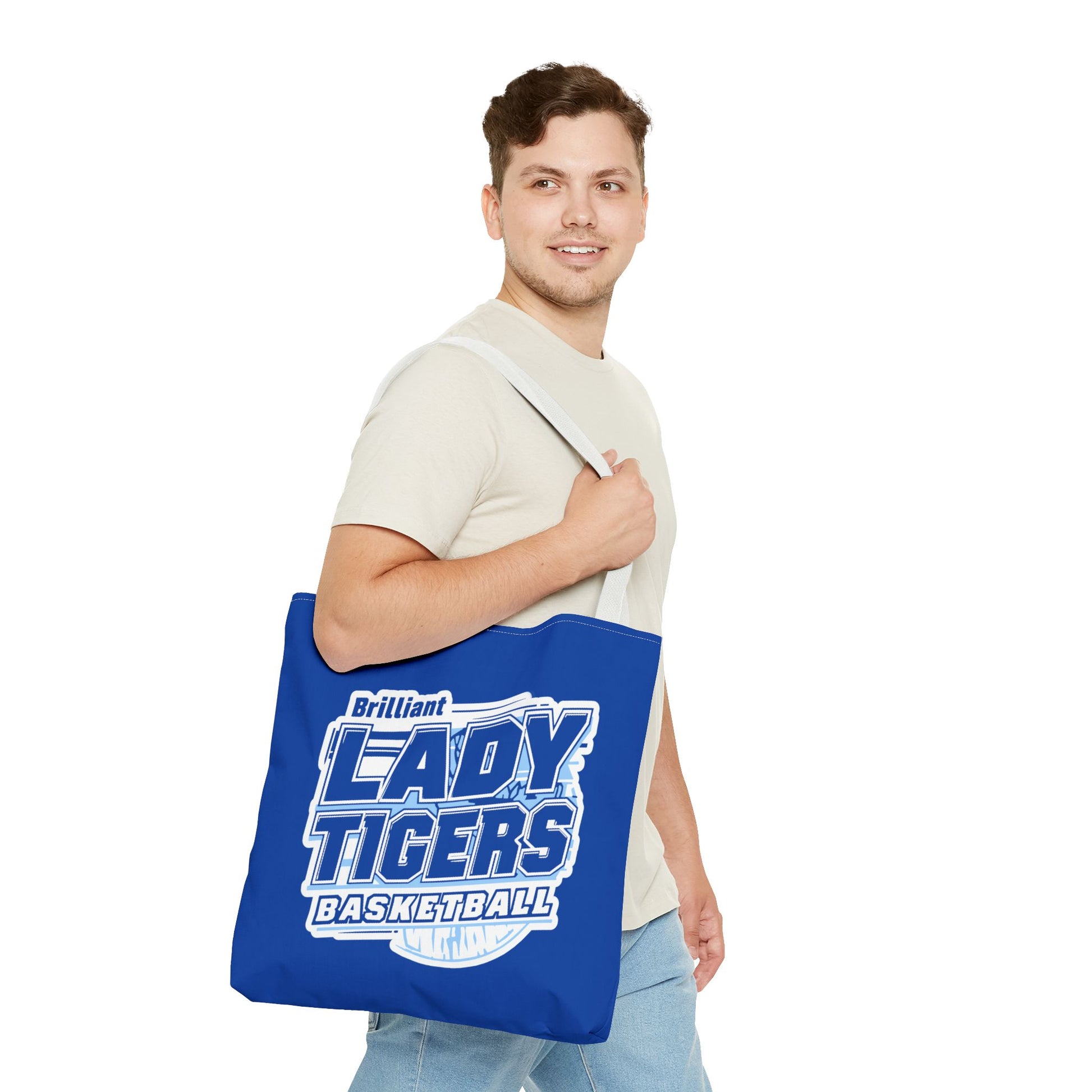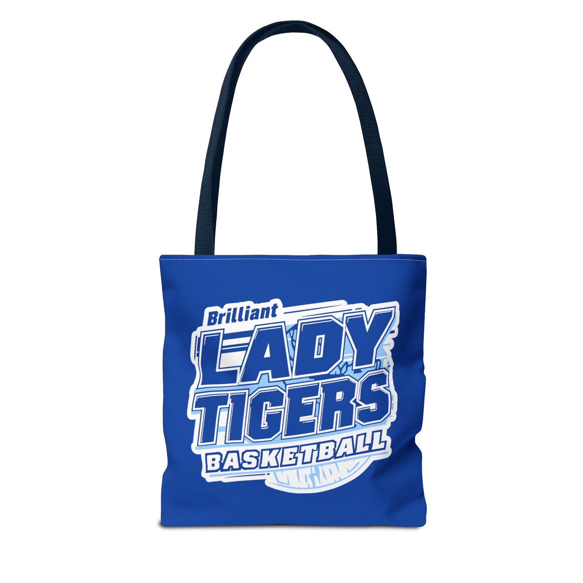 Bright, roomy, and built to carry the season’s essentials: this printed tote brings team spirit into everyday life. The vivid royal-blue canvas showcases a bold “Lady Tigers Basketball” crest that reads like a rallying cry — slightly vintage in feel, crisp in print. The structured boxed corners give it extra room for a water bottle, rulebook, or gym shoes, while reinforced handles and durable polyester keep it carrying strong through practices, carpool lines, and courtside cheers. Lightweight and quick-drying, it slips over a shoulder with cotton straps and stands up to frequent use without losing shape. Use it to hold game-day gear, sideline supplies, or spirited extras for pep rallies and community events.