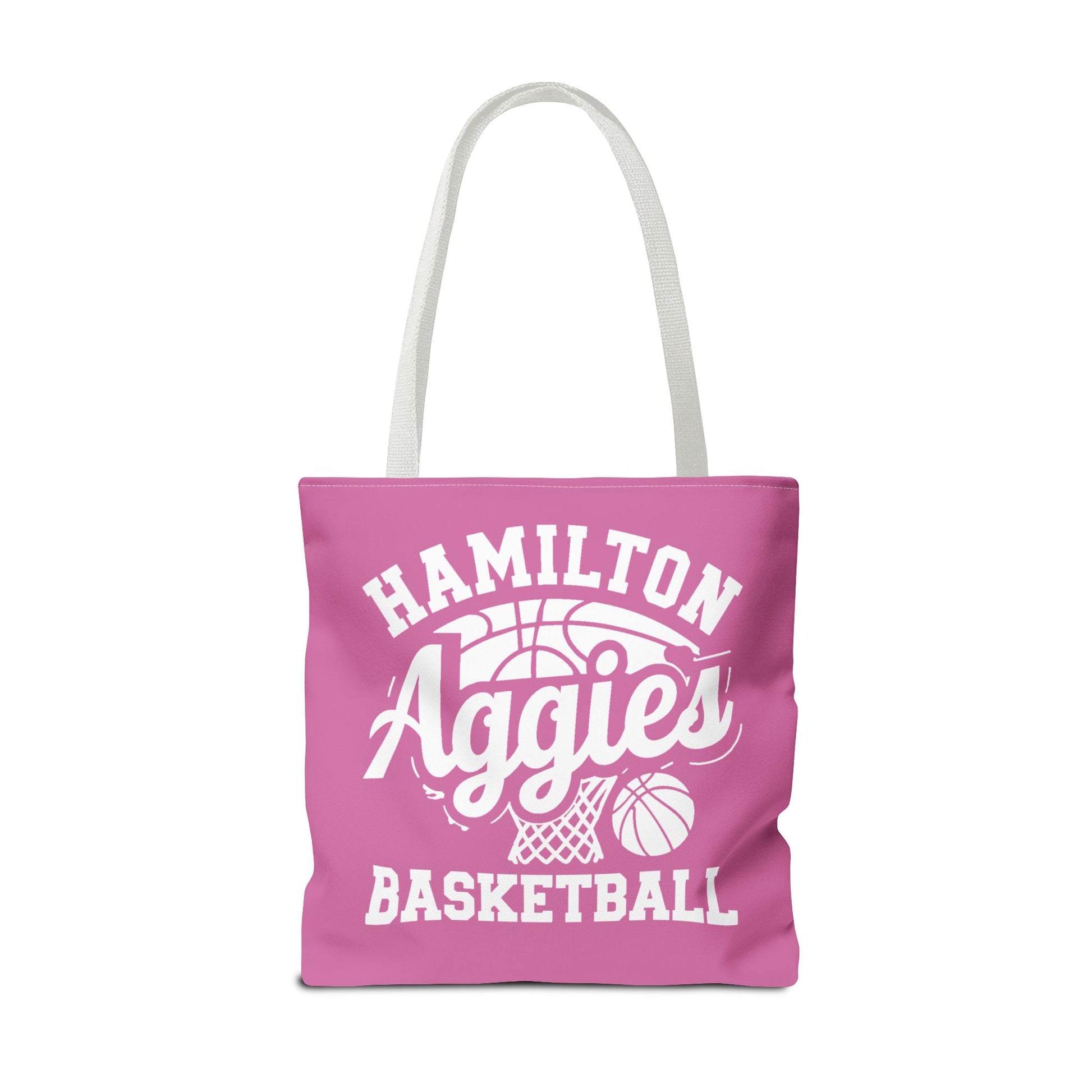 Carry team pride wherever you go. This roomy tote blends sporty energy with everyday function — a soft pink canvas printed with bold white varsity lettering, a stylized basketball and net, and a spirited “Aggies” script that pops against the background. The bag’s boxed corners and reinforced handle stitching mean it holds practice gear, groceries, or game-day essentials without sagging. Lightweight yet durable polyester with a laminated interior keeps the shape and resists moisture, while contrasting black handles add a clean, athletic finish. Reach for it on school days, weekend tournaments, or casual outings to show support and keep your hands free.