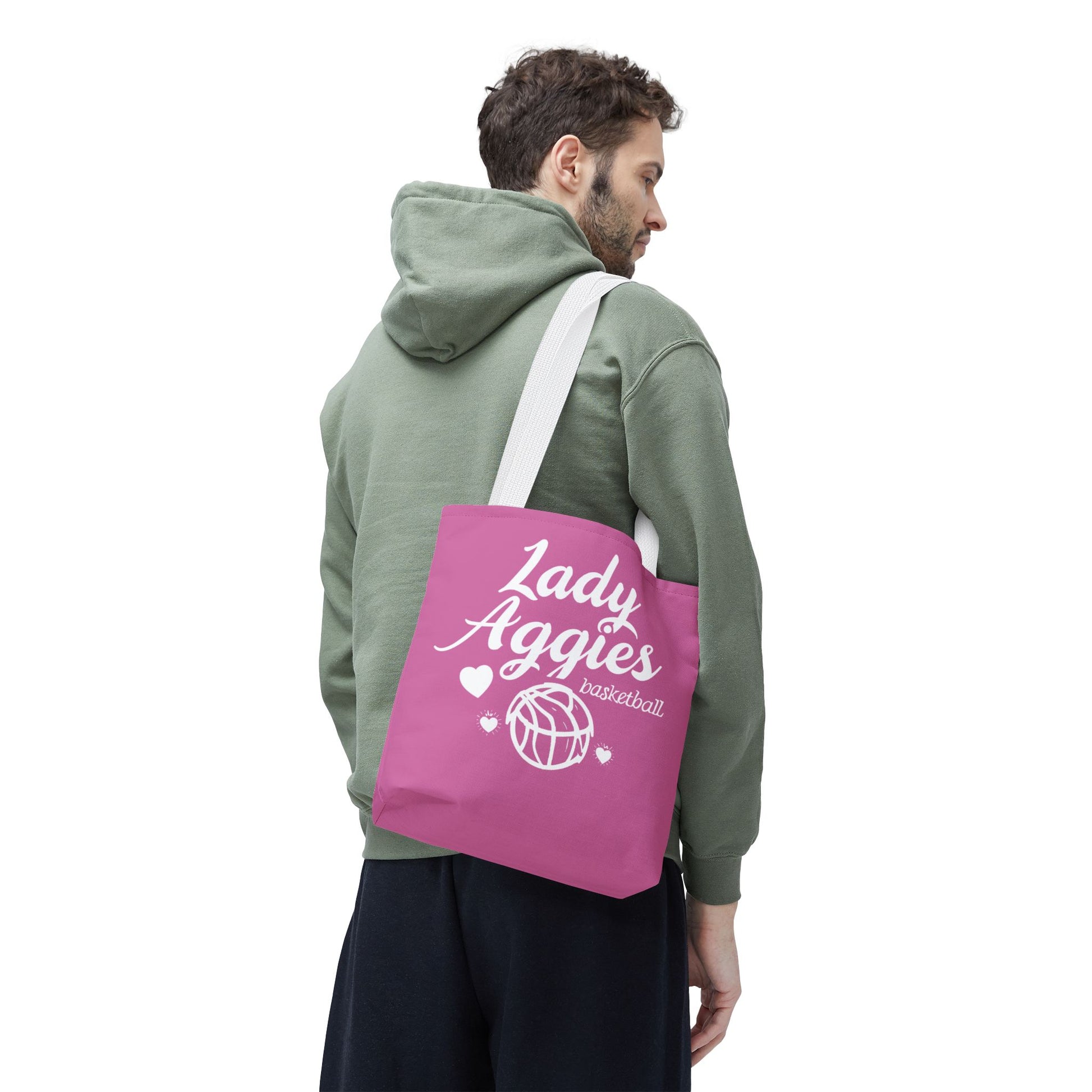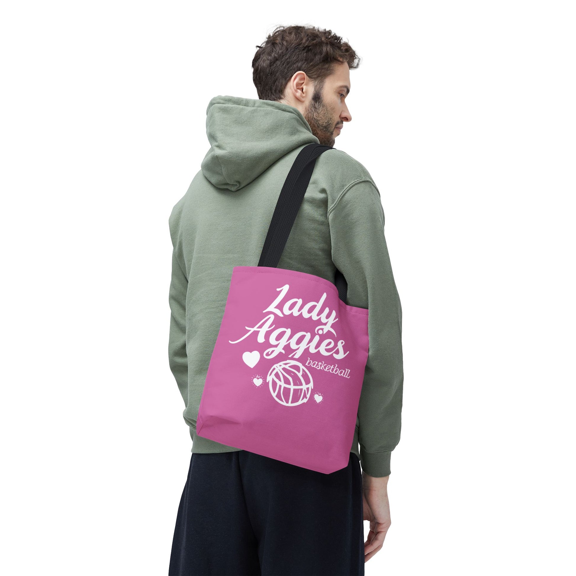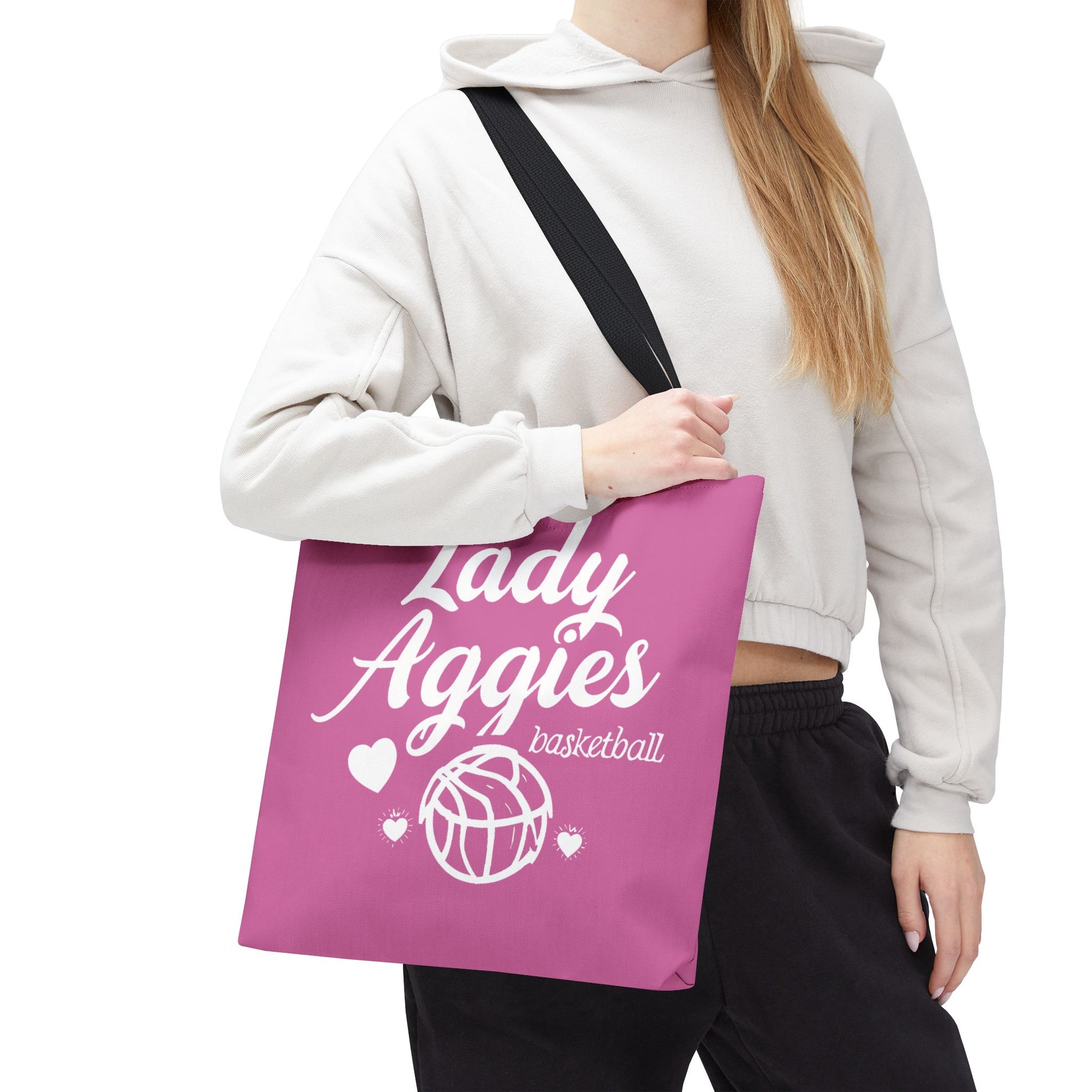 Carry team pride everywhere with a lively, soft-feel tote that reads like a pep rally in fabric. The warm pink canvas and playful white lettering — “Lady Aggies” with a doodled basketball and tiny hearts — feels youthful and spirited. It slips over your shoulder easily, holds practice-day essentials or game-day snacks, and stands up to daily wear thanks to a durable polyester body and reinforced handles. Whether headed to gym class, a weekend tournament, or around-town errands, this tote brings a bit of school-spirit charm and everyday usefulness together in one bright, roomy bag.